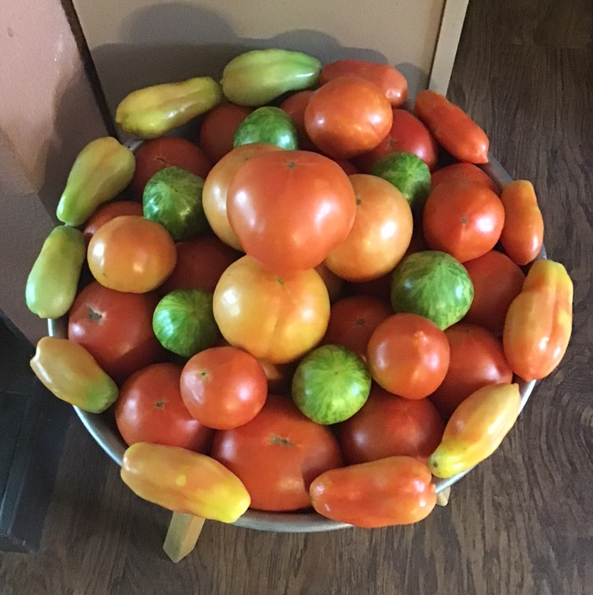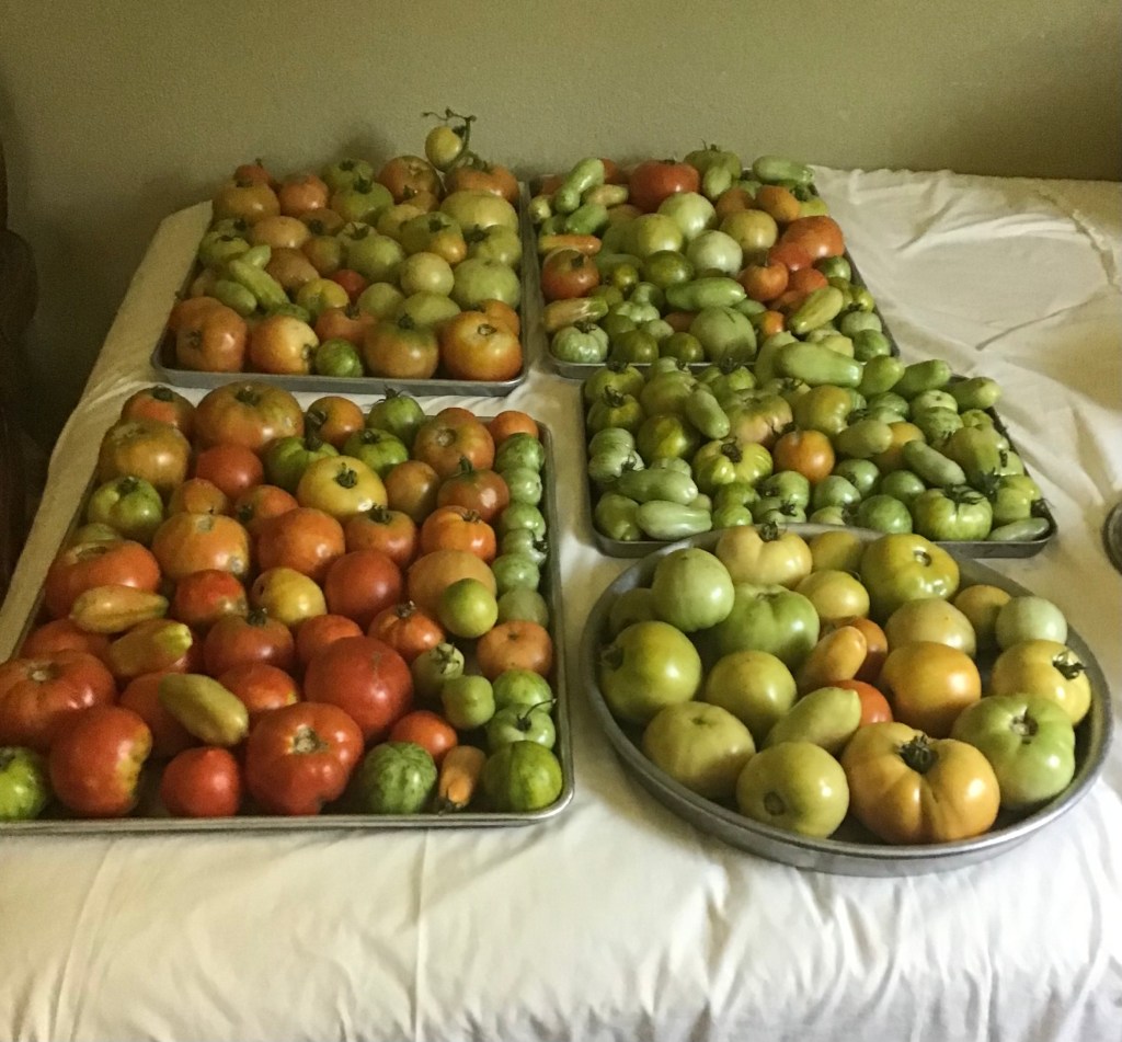 And, while we do (still!) have a bumper crop, it’s not exactly ideal, because once again, it’s so hot so fast that they are burning and exploding on the vine if I try to let them ripen properly. So, I have to bring them in to ripen, which means I’m really, really sick of looking at them everywhere.