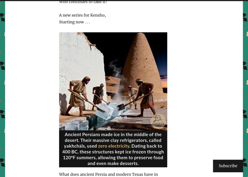 Last time I shared about the Yakhchal, a common radiative cooling system used from ancient times, still in operation in parts of the Middle East, and perhaps close by as well, as close as Dallas.